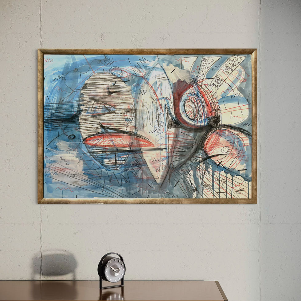 Umjetničko djelo izrađeno kombiniranom tehnikom na papiru, s naglaskom na prozračne, akvarelne slojeve koji se energično isprepliću preko površine. Dinamični potezi i živahni prijelazi boja stvaraju osjećaj pokreta i spontanosti, dok akvarelna prozračnost daje djelu svježinu i lakoću. Bez naglašene teksture, fokus je na ritmu linija i fluidnosti boje. Slika je uokvirena staklom.
